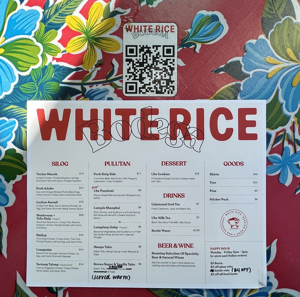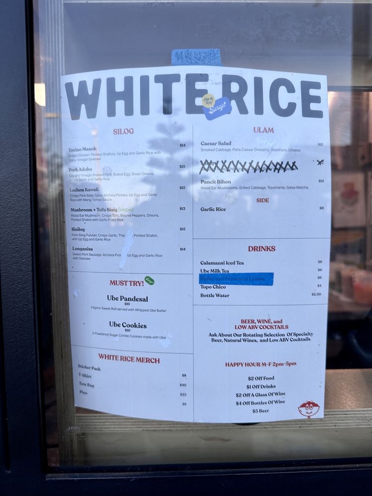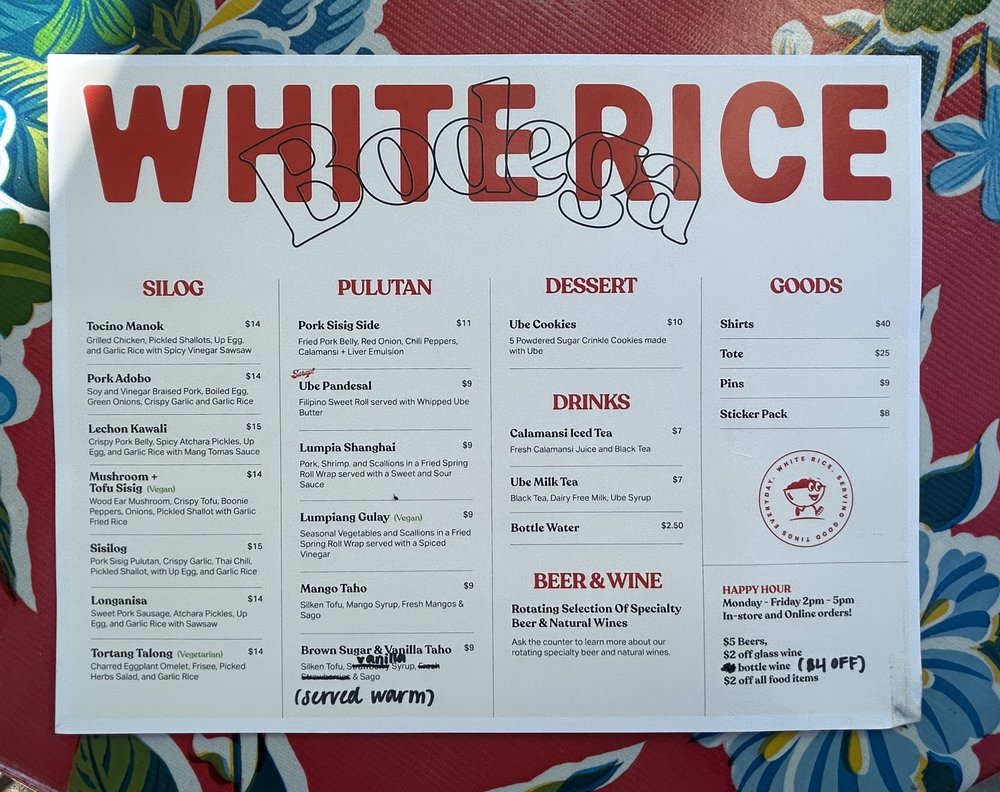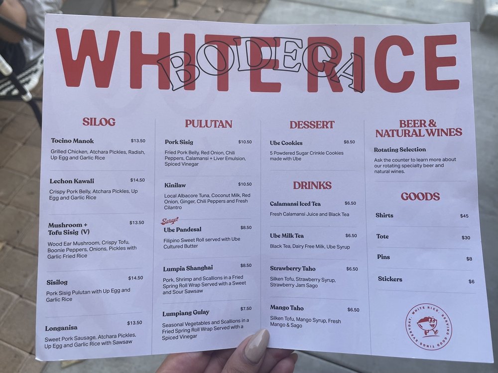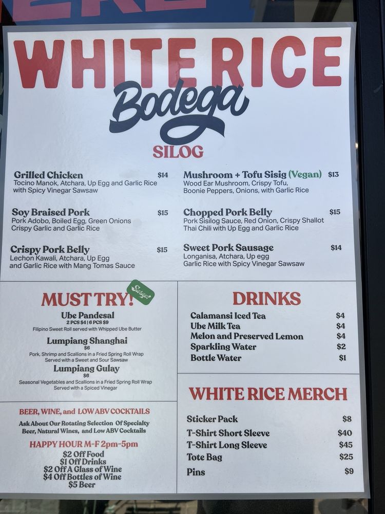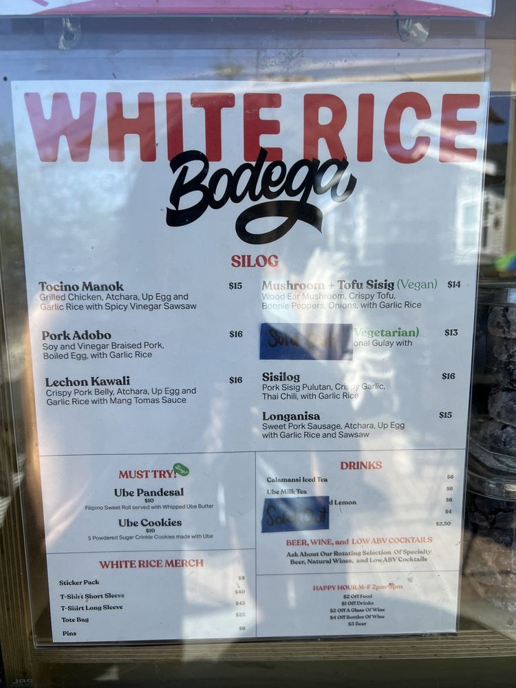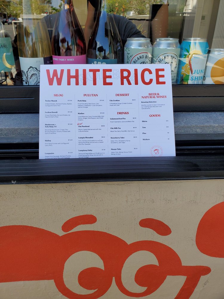 Introducing the menu at White Rice Bodega, a Filipino restaurant located in San Diego, CA. Known for its quick service and great variety of dishes, this casual and trendy spot offers a wide range of options, including vegan and limited vegetarian choices. With features like outdoor seating, waiter service, and happy hour specials, White Rice Bodega caters to all preferences. The menu boasts popular items like pork belly with rice and egg, calamansi drink, lumpia, and pan de sal. Customers rave about the fresh and delicious food, from sisilog bowls to ube pandesal with whipped butter. The attentive staff and chill atmosphere make dining here a delightful experience. Whether you're a Filipino food enthusiast or simply looking to try something new, White Rice Bodega promises a satisfying meal that will keep you coming back for more.